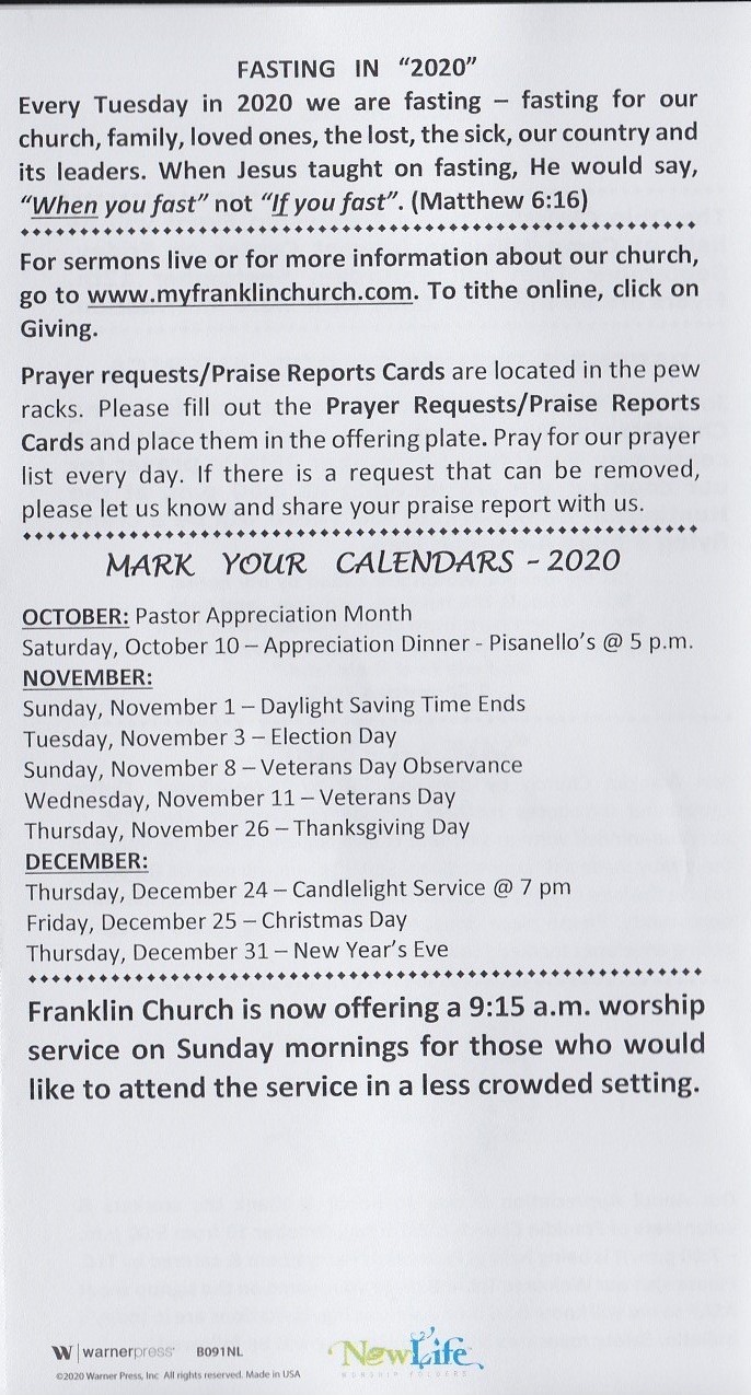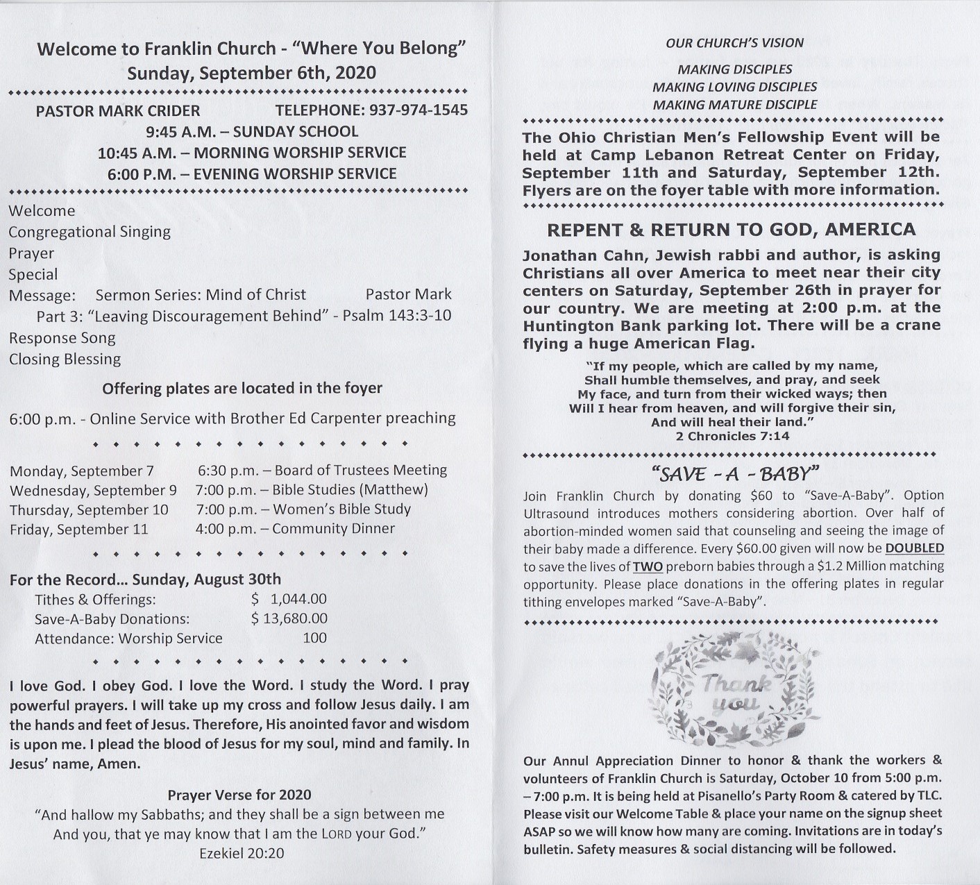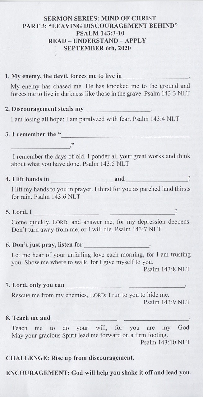 Posted by My Franklin Church on Sunday, September 06, 2020 Mind of Christ - Part 3 - Leaving Discouragement Behind Pastor Mark - 9/6/2020 Downloads & Resources Video Download Audio Download